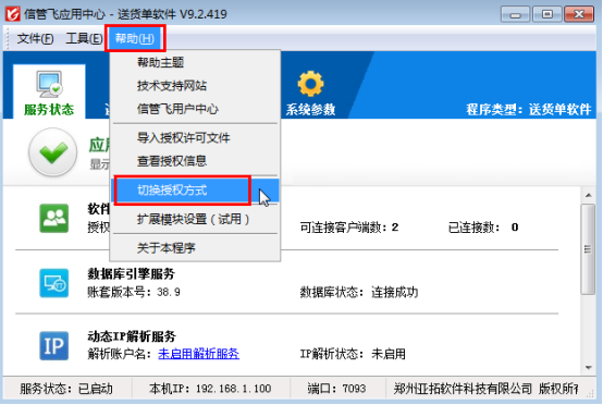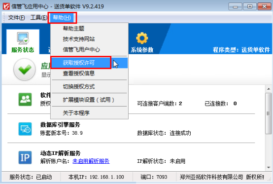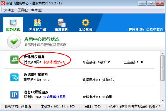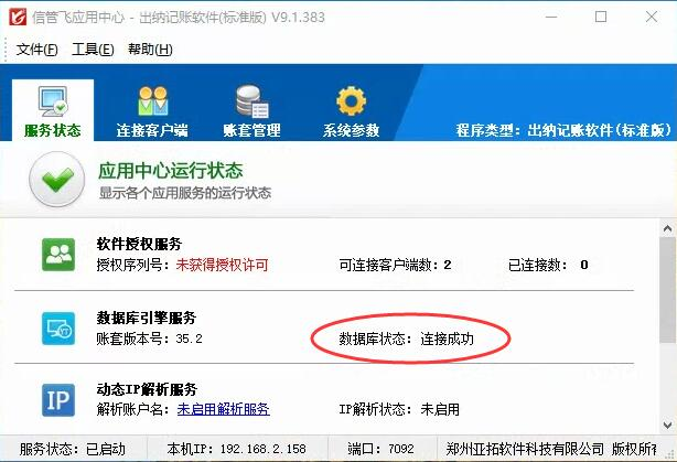 ????信管飛應(yīng)用中心退出后請(qǐng)重新運(yùn)行信管飛應(yīng)用中心程序,應(yīng)用中心啟動(dòng)后,請(qǐng)檢查服務(wù)狀態(tài)是否已啟動(dòng)正常,軟件授權(quán)服務(wù)是否顯示正常及數(shù)據(jù)庫狀態(tài)是否連接正常,正常狀態(tài)如下圖所示,服務(wù)狀態(tài)顯示正常,請(qǐng)嘗試重新登錄軟件。