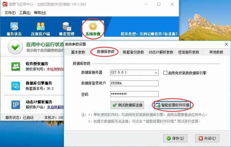 ????軟件默認(rèn)安裝在非系統(tǒng)盤D盤,如果只重裝系統(tǒng)盤則不影響非系統(tǒng)盤,重裝完成后,可打開D盤找到“信管飛軟件”,雙擊打開紅色應(yīng)用中心程序,打開后可看到“數(shù)據(jù)庫狀態(tài):連接失敗”(數(shù)據(jù)庫文件默認(rèn)安裝在系統(tǒng)盤,重裝會(huì)清空),可點(diǎn)擊上方工具欄下的“智能修復(fù)軟件環(huán)境”,修復(fù)成功后退出應(yīng)用中心程序,重新打開即可正常登陸。如下圖所示: