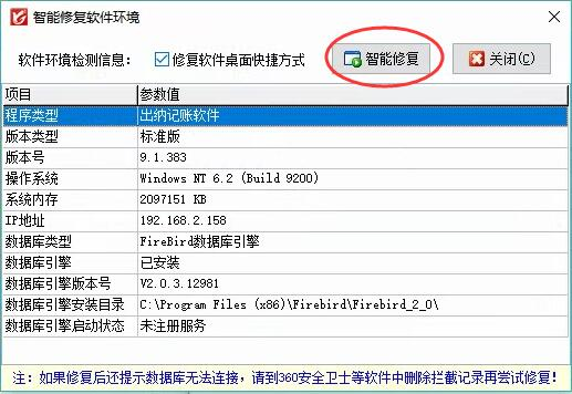 ????在軟件應(yīng)用中心程序中,點(diǎn)擊“系統(tǒng)參數(shù)”->“數(shù)據(jù)庫參數(shù)”打開數(shù)據(jù)庫參數(shù)配置界面,然后點(diǎn)擊“智能修復(fù)軟件環(huán)境”按鈕打開智能修復(fù)軟件環(huán)境界面智能修復(fù)軟件環(huán)境即可,如下圖所示(或者在軟件應(yīng)用中心程序中點(diǎn)菜單“工具”->“智能修復(fù)軟件環(huán)境”同樣可以打開智能修復(fù)軟件環(huán)境界面智能修復(fù)軟件環(huán)境)。