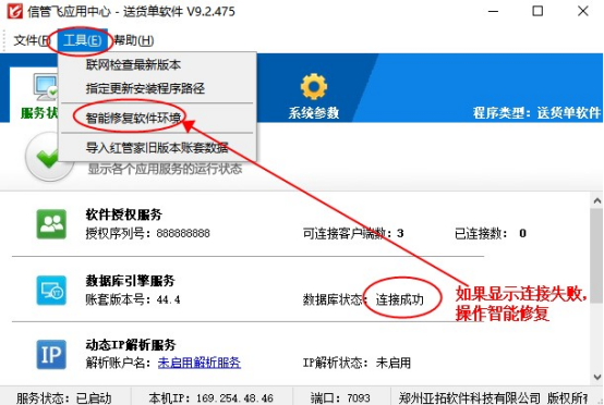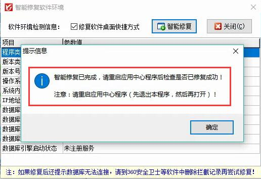 ????如智能修復(fù)軟件環(huán)境完成后,重啟應(yīng)用中心程序數(shù)據(jù)庫狀態(tài)仍顯示為連接失敗,請(qǐng)聯(lián)系我們?cè)诰€客服解決。