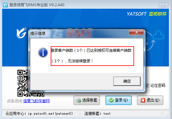 ????信管飛所有軟件都支持云賬套服務(wù)模式,數(shù)據(jù)存在云服務(wù)上,本地只要有網(wǎng)絡(luò)就可以登錄客戶端程序連接數(shù)據(jù)使用,云賬套模式是按用戶數(shù)進(jìn)行收費(fèi)使用的,經(jīng)常有客戶反映登錄其它電腦客戶端的時(shí)候提示“登錄客戶端數(shù)已達(dá)到授權(quán)可連接用戶數(shù),無法繼續(xù)登錄”,如下圖所示。為了可繼續(xù)使用,軟件支持可直接操作“斷開連接”,本文以信管飛RMS軟件為例進(jìn)行示范。