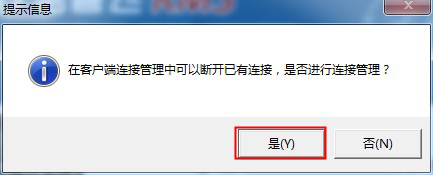 ????出現(xiàn)授權(quán)達(dá)到最大用戶數(shù)提示后,點(diǎn)擊“確定”按鈕,可以看到提示信息“在客戶端連接管理中可以斷開已有連接,是否進(jìn)行連接管理”,點(diǎn)擊是進(jìn)入下一選擇,如下圖所示: