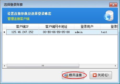 ????點(diǎn)擊“是”,進(jìn)入管理連接客戶端界面??梢赃x擇當(dāng)前登錄的連接,點(diǎn)擊“斷開連接”,可斷開當(dāng)前已登錄的客戶端程序,然后可以重新登錄。如下圖所示: