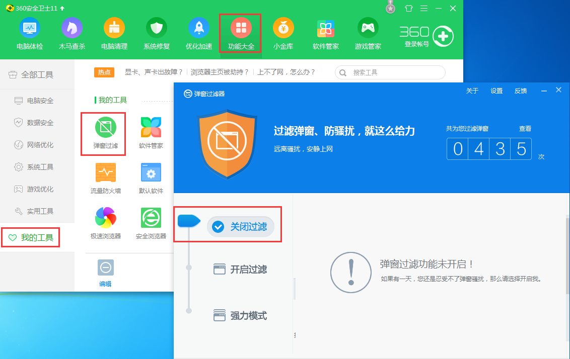 ????打開360安全衛(wèi)士,在“功能大全”—》“我的工具”內(nèi)找到“彈窗過濾”工具打開彈窗過濾器,點(diǎn)擊“關(guān)閉過濾”即可。