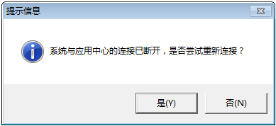 ????第一種解決方式:鼠標(biāo)雙擊軟件界面最下方的“連接狀態(tài):已斷開”字樣,系統(tǒng)會(huì)彈出“系統(tǒng)與應(yīng)用中心的連接已斷開,是否嘗試重新連接?”提示信息,如下圖所示,點(diǎn)“是”按鈕,客戶端程序會(huì)嘗試重新建立與應(yīng)用中心程序的連接。如果連接成功即可打開相應(yīng)的功能,繼續(xù)使用軟件。