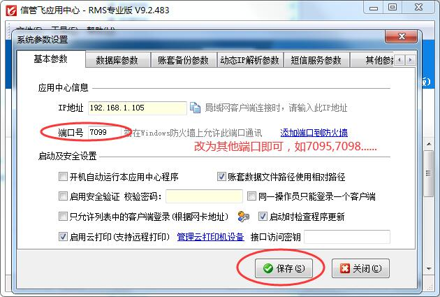 ????修改通訊端口的方法也很簡單,在“信管飛軟件應(yīng)用中心”程序中,點(diǎn)“系統(tǒng)參數(shù)設(shè)置”中基礎(chǔ)參數(shù)中修改端口號(hào)為其他未使用的端口即可,比如7098、7097、7096...,修改保存參數(shù)后,需重啟“亞拓軟件應(yīng)用中心”程序,以便使配置生效。同時(shí),客戶端程序登錄的時(shí)候,也要使用新的端口(方法:在登錄窗口,點(diǎn)“選擇賬套”按鈕,輸入新的通訊端口號(hào))。