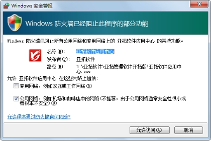 ????首次運(yùn)行應(yīng)用中心程序,如果防火墻彈出提示窗口,則Win7系統(tǒng)請(qǐng)點(diǎn)擊“允許訪問”按鈕允許訪問(專有網(wǎng)絡(luò)不需要打勾選擇);WinXP系統(tǒng)請(qǐng)點(diǎn)擊“解除阻止”按鈕即可。