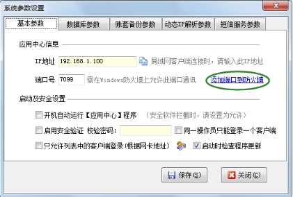 ????主機(jī)電腦的Windows防火墻或其他安全軟件的防火墻上需要開放相應(yīng)的端口,軟件支持自動(dòng)添加防火墻規(guī)則。在應(yīng)用中心程序點(diǎn)“系統(tǒng)參數(shù)”可以設(shè)置自動(dòng)添加端口到防火墻。