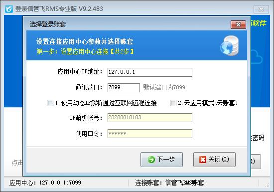????點(diǎn)擊桌面上的“信管飛RMS”程序(以下簡稱“客戶端程序”)圖標(biāo)(或者在開始菜單中點(diǎn)擊程序組中的相應(yīng)功能),即可打開客戶端程序。點(diǎn)“選擇賬套”按鈕,可以輸入“應(yīng)用中心”所在電腦(即主機(jī)電腦)的IP地址以及通訊端口,如果是通過互聯(lián)網(wǎng)遠(yuǎn)程連接請(qǐng)輸入購買動(dòng)態(tài)IP解析服務(wù)后我們提供的IP解析帳號(hào)和使用口令,然后點(diǎn)“下一步”按鈕,選擇要登錄的賬套。