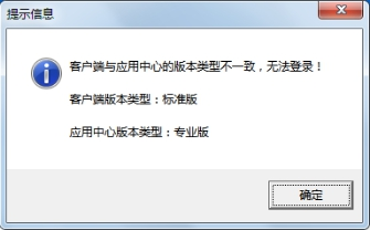 ????③如果登錄的時(shí)候提示如下信息,則表明客戶端程序的版本類型與主機(jī)電腦上的應(yīng)用中心程序的版本類型不一致,請(qǐng)使用相同版本類型的程序登錄即可。