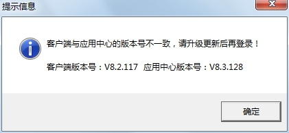 ????④客戶端程序登錄的時(shí)候,如果發(fā)現(xiàn)與主機(jī)電腦上的應(yīng)用中心程序版本號(hào)不一致,會(huì)提示如下信息,用相同版本的安裝程序安裝一下即可。
