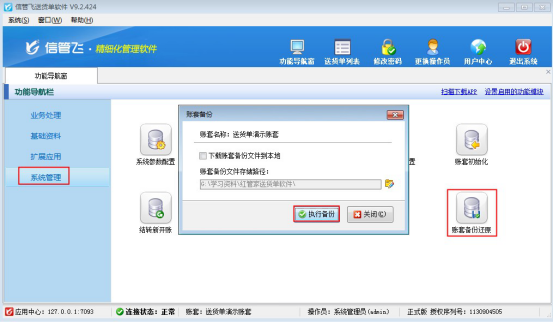 ????信管飛送貨單軟件、信管飛RMS軟件、信管飛出納記賬軟件等都支持網(wǎng)絡(luò)版和單機版,網(wǎng)絡(luò)版本默認需要固定一臺電腦作為主機電腦,需打開紅色應(yīng)用中心程序,客戶端電腦安裝客戶端程序,默認需要局域網(wǎng)下連接主機電腦紅色應(yīng)用中心ip地址,紅色應(yīng)用中心程序可操作賬套新增以及備份還原等,為避免主機忘記備份,客戶端電腦可直接在客戶端程序上進行執(zhí)行備份操作以及可下載備份文件到本地,本文以“信管飛送貨單軟件”為例,示范下客戶端電腦如何執(zhí)行備份及下載備份到本地。