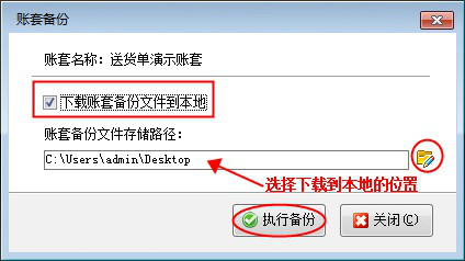 ????在賬套備份界面。勾選“下載賬套備份文件到本地”,選擇下存儲路徑,文章以存在“電腦桌面”為例,然后點擊“執(zhí)行備份”操作,會把備份文件下載到本地桌面上,如下圖所示:
