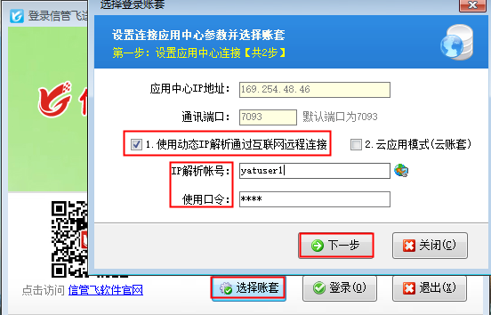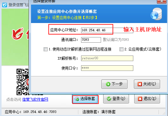 ????客戶端電腦登錄界面“選擇賬套”—》“使用動態(tài)IP解析通過互聯(lián)網(wǎng)遠程連接”,輸入IP解析賬號和使用口令,點擊“下一步”,選擇賬套,選擇操作員并填寫密碼,進入軟件首頁。