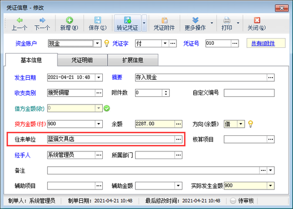 ????在功能導(dǎo)航窗點(diǎn)擊“出納管理”—》“現(xiàn)金日記賬”,新增日記賬憑證時(shí)選擇一下往來單位信息,如下圖所示。