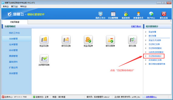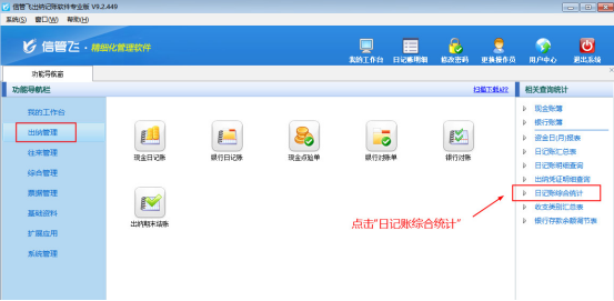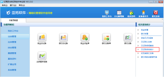 ????然后在“出納管理”模塊最右側(cè)的“相關(guān)查詢統(tǒng)計(jì)”內(nèi)點(diǎn)擊“日記賬綜合統(tǒng)計(jì)”,打開“日記賬綜合統(tǒng)計(jì)”界面,如下圖所示。