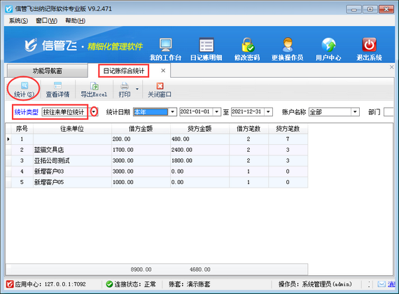 ????在“日記賬綜合統(tǒng)計(jì)”界面,統(tǒng)計(jì)類型選擇“按往來單位統(tǒng)計(jì)”,然后點(diǎn)擊“統(tǒng)計(jì)”按鈕,可以根據(jù)往來單位進(jìn)行統(tǒng)計(jì)。另外,系統(tǒng)支持根據(jù)日期、賬戶名稱、部門、經(jīng)手人等條件進(jìn)行統(tǒng)計(jì)查詢。