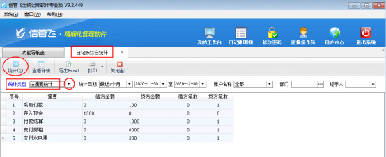 ????在“日記賬綜合統(tǒng)計(jì)”界面,統(tǒng)計(jì)類型選擇“按摘要統(tǒng)計(jì)”,然后點(diǎn)擊“統(tǒng)計(jì)”按鈕,可以根據(jù)摘要進(jìn)行統(tǒng)計(jì)。另外,系統(tǒng)支持根據(jù)日期、賬戶名稱、部門、經(jīng)手人等條件進(jìn)行統(tǒng)計(jì)查詢。