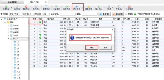 ????在現(xiàn)金日記賬列表界面,如圖2所示,點(diǎn)擊“更多操作”—》“反審憑證”,系統(tǒng)彈出提示信息“您確定要反審當(dāng)前憑證?”,點(diǎn)擊“確定”按鈕,如圖3所示。