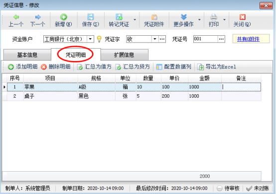 ????在功能導(dǎo)航窗點(diǎn)“出納管理”—》“銀行日記賬”,新增憑證界面點(diǎn)擊“憑證明細(xì)”,可以添加憑證明細(xì)內(nèi)容,如圖1所示: