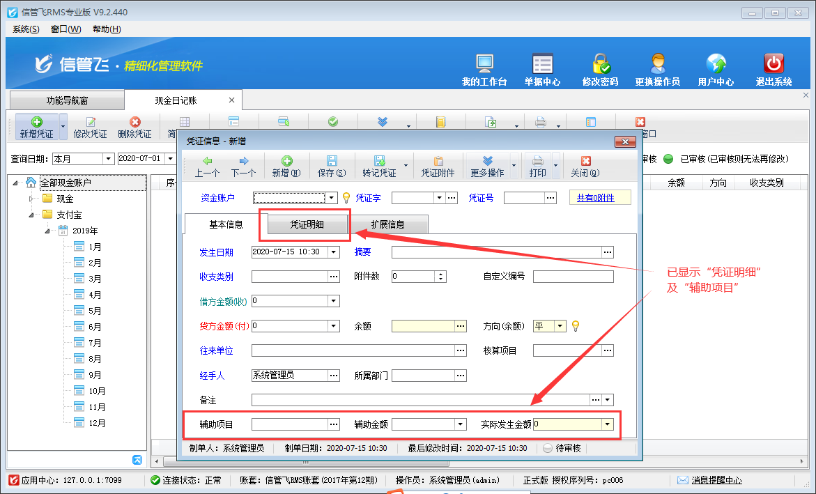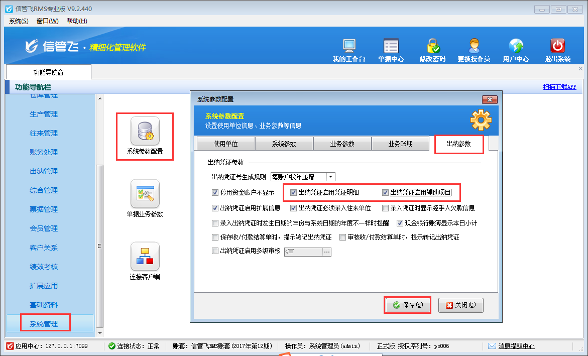 ????信管飛出納記賬軟件、信管飛RMS(標(biāo)準(zhǔn)版、專業(yè)版)中的出納管理模塊,在新增憑證中有的需要填寫輔助項(xiàng)目和憑證明細(xì),軟件支持設(shè)置在新增憑證時(shí)顯示這些項(xiàng)目。下邊以信管飛RMS為例,演示一下如何設(shè)置出納憑證啟用憑證明細(xì)和輔助項(xiàng)目。