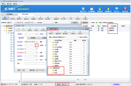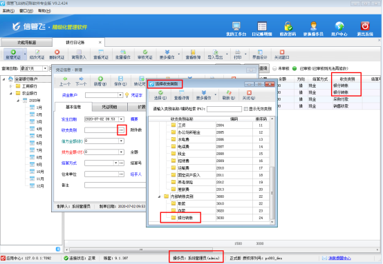 ????系統(tǒng)管理員登錄軟件后可以看到“銀行轉(zhuǎn)賬”相關(guān)的出納憑證,如圖3所示。而使用操作員“張亞”登錄軟件,日記賬列表內(nèi)看不到收支類別為“銀行轉(zhuǎn)賬”的憑證記錄,新增憑證界面在選擇收支類別窗口也無法選擇到“銀行轉(zhuǎn)賬”,如下圖4所示: