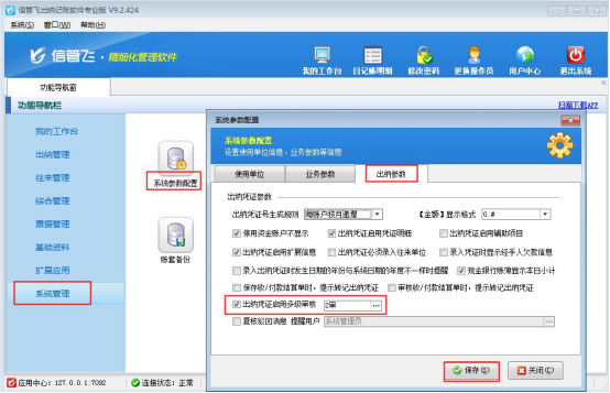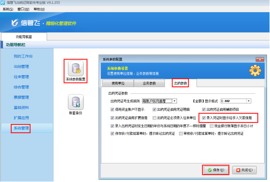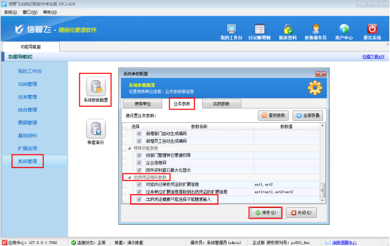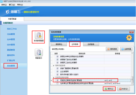 ????在功能導(dǎo)航窗點(diǎn)擊“系統(tǒng)管理”——》“系統(tǒng)參數(shù)配置”——》“業(yè)務(wù)參數(shù)”可以進(jìn)入到“業(yè)務(wù)參數(shù)”配置界面,在出納憑證相關(guān)參數(shù)內(nèi)打勾啟用“出納憑證摘要只能選擇不能隨意輸入”參數(shù),然后保存,如下圖所示: