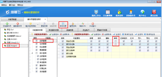 ????在功能導(dǎo)航窗選擇“系統(tǒng)管理”—》“操作員及授權(quán)”—》選擇操作員“王五”,在功能模塊權(quán)限中選擇“出納管理”,右側(cè)權(quán)限設(shè)置把現(xiàn)金日記賬和銀行日記賬的可審核權(quán)限的勾選符號取消,然后點(diǎn)擊“保存設(shè)置”按鈕進(jìn)行保存權(quán)限,如下圖1所示: