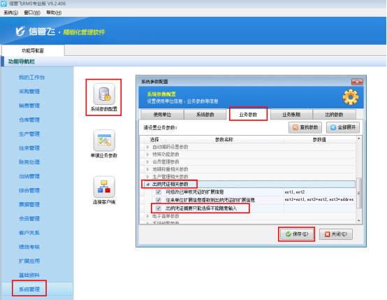 ????在功能導(dǎo)航窗點(diǎn)擊“系統(tǒng)管理”→“系統(tǒng)參數(shù)設(shè)置”→“業(yè)務(wù)參數(shù)”可以進(jìn)入到“業(yè)務(wù)參數(shù)”配置界面,在業(yè)務(wù)單據(jù)相關(guān)參數(shù)內(nèi)打勾啟用“可修改已審核憑證的擴(kuò)展信息”參數(shù),并設(shè)置參數(shù)值(擴(kuò)展信息字段名),默認(rèn)為“ext1,ext2(擴(kuò)展信息1,擴(kuò)展信息2)”,如下圖所示: