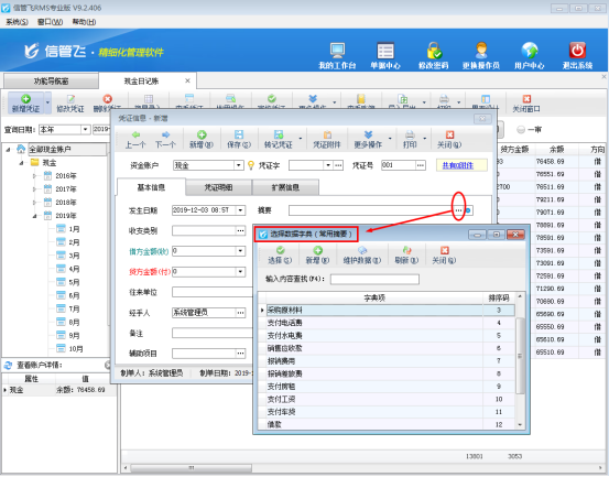 ????信管飛RMS標(biāo)準(zhǔn)版和專業(yè)版都包括出納模塊,可以登記出納日記賬憑證,出納憑證摘要默認(rèn)可以手動(dòng)隨意輸入。有些客戶對出納憑證摘要需要進(jìn)行規(guī)范管理,登記憑證時(shí)摘要只能選擇不能隨意輸入該如何設(shè)置呢?本篇文章以信管飛RMS專業(yè)版為例介紹一下如何設(shè)置出納憑證摘要只能選擇不能隨意輸入。