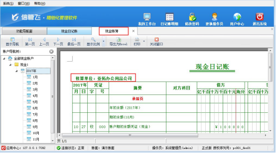 ????出納記賬軟件下載安裝完成后,使用演示賬套中的資金賬戶登記現(xiàn)金日記賬,在現(xiàn)金日記賬界面,點(diǎn)擊“查看賬簿”,可進(jìn)入現(xiàn)金賬簿界面,如下圖1所示,可看到核算單位顯示:亞拓辦公用品公司,如果需要修改為自己公司信息,該如何修改?本文以“信管飛出納記賬軟件”為例,示范如何修改現(xiàn)金賬簿中的核算單位。