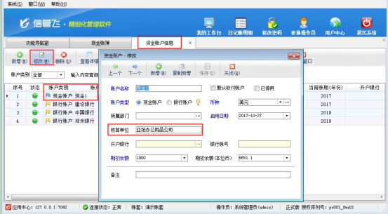 ????現(xiàn)金賬簿中的核算單位默認(rèn)是調(diào)用資金賬戶提前維護(hù)好的核算單位信息,因此需要修改此內(nèi)容,需要到資金賬戶中找到當(dāng)前現(xiàn)金賬戶進(jìn)行修改,在功能導(dǎo)航窗選擇“基礎(chǔ)資料”—》“資金賬戶”,找到現(xiàn)金賬戶“現(xiàn)金1”,點(diǎn)擊修改按鈕,可修改核算單位信息。如下圖2所示:
