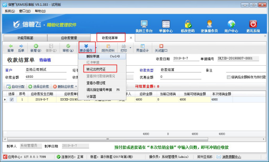 ????信管飛RMS標(biāo)準(zhǔn)版和專業(yè)版中增加了出納模塊,可以登記現(xiàn)金銀行日記賬。信管飛RMS 軟件中用戶在做收款結(jié)算后如需要把這筆賬管理到日記賬中,可以在收款時(shí)轉(zhuǎn)記到出納日記賬中。在軟件中如何操作呢?