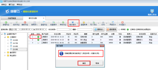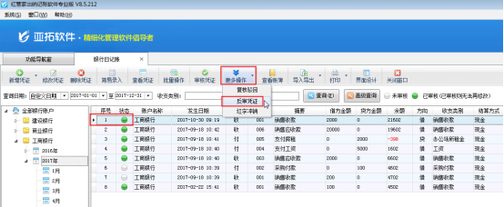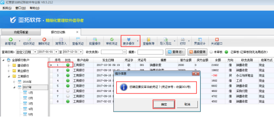 ????在銀行日記賬列表界面,如圖2所示,點(diǎn)擊“更多操作”——》“反審憑證”,系統(tǒng)彈出提示信息“您確定要反審當(dāng)前憑證?”,點(diǎn)擊“確定”按鈕,如圖3所示。