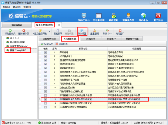 ????信管飛出納記賬軟件、信管飛RMS標(biāo)準(zhǔn)版和專業(yè)版都支持設(shè)置操作員不可查看其他人員錄入的出納憑證的權(quán)限,本篇文章以信管飛出納記賬軟件專業(yè)版為例詳細(xì)介紹一下如何設(shè)置操作員不可查看其他人員錄入的出納憑證。