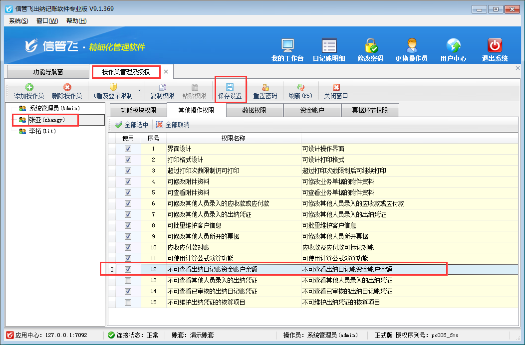 ????信管飛出納記賬軟件、信管飛RMS(標(biāo)準(zhǔn)版、專業(yè)版)都有出納模塊,可以管理現(xiàn)金日記賬和銀行日記賬。許多用戶在出納管理有審核出納憑證人員,軟件支持設(shè)置操作員的日記賬憑證的審核權(quán)限。以信管飛出納記賬軟件專業(yè)版本為例,介紹一下如何設(shè)置操作員不可審核現(xiàn)金日記賬、銀行日記賬的方法。