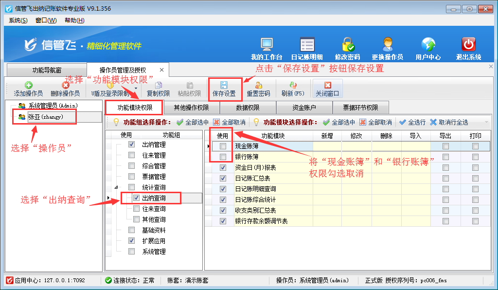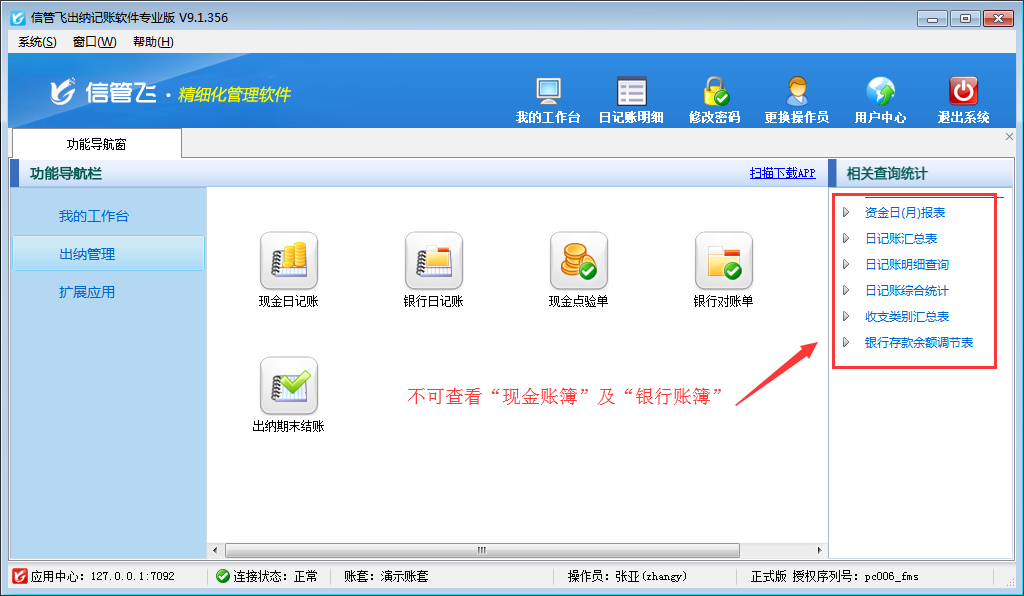 ????信管飛出納記賬軟件內(nèi)包含豐富的記賬統(tǒng)計(jì)表格,如現(xiàn)金賬簿、銀行賬簿、資金日(月)報(bào)表、收支類別匯總表等。如果不希望員工賬號登錄后導(dǎo)出這些報(bào)表,如何設(shè)置呢?本篇文章以信管飛出納記賬軟件專業(yè)版為例演示一下出納記賬軟件內(nèi)如何設(shè)置操作員不可導(dǎo)出現(xiàn)金及銀行賬簿。