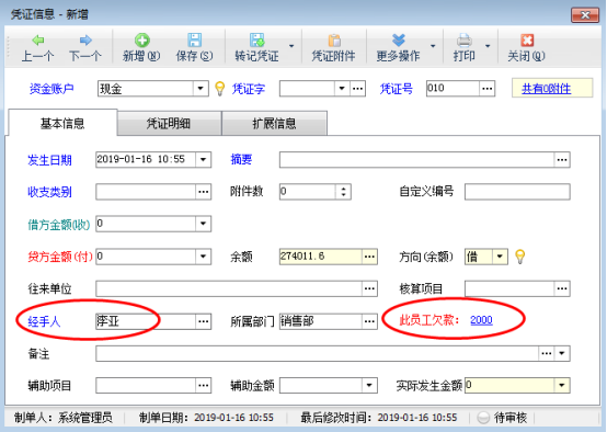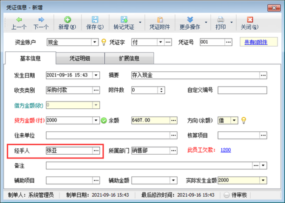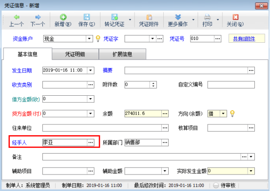 ????在功能導(dǎo)航窗點(diǎn)擊“出納管理”—》“現(xiàn)金日記賬”,新增日記賬憑證時(shí)選擇一下經(jīng)手人信息,如下圖所示。