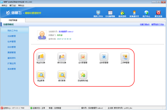 ????信管飛出納記賬軟件是一款針對各類企事業(yè)單位財(cái)務(wù)出納記賬開發(fā)的,集現(xiàn)金日記賬記賬與點(diǎn)驗(yàn)、銀行日記賬記賬與核帳、應(yīng)收應(yīng)付往來賬管理、票據(jù)管理(支票管理、承兌匯票管理)、發(fā)票管理、工資管理、員工借款管理、費(fèi)用報(bào)銷管理等為一體的出納管理軟件。