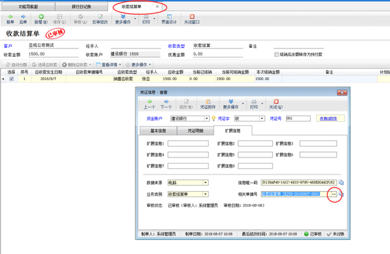 ????為便捷用戶操作,軟件支持設(shè)置憑證審核時(shí)自動(dòng)審核相關(guān)結(jié)算單,本文以“信管飛出納記賬軟件”的收款結(jié)算單為例進(jìn)行示范。