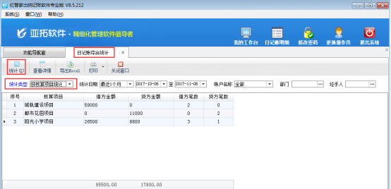 ????在“日記賬綜合統(tǒng)計(jì)”界面,統(tǒng)計(jì)類型選擇“按經(jīng)手人統(tǒng)計(jì)”,然后點(diǎn)擊“統(tǒng)計(jì)”按鈕,可以根據(jù)經(jīng)手人進(jìn)行統(tǒng)計(jì)。另外,系統(tǒng)支持根據(jù)日期、賬戶名稱、部門、經(jīng)手人等條件進(jìn)行統(tǒng)計(jì)查詢。