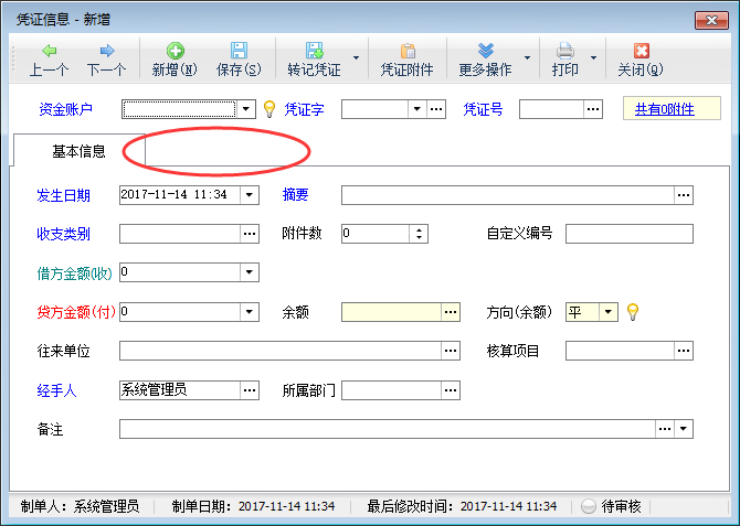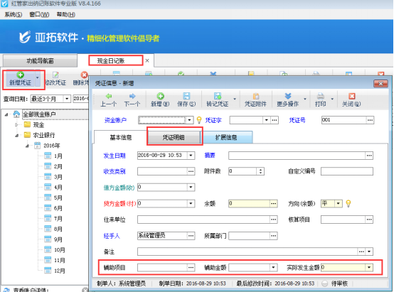 ????參數(shù)啟用后,在功能導(dǎo)航窗點(diǎn)擊“出納管理”—》“現(xiàn)金日記賬”打開現(xiàn)金日記賬界面,新增日記賬,在新增憑證界面即可顯示“輔助項(xiàng)目”、“憑證明細(xì)”,如下圖所示:
