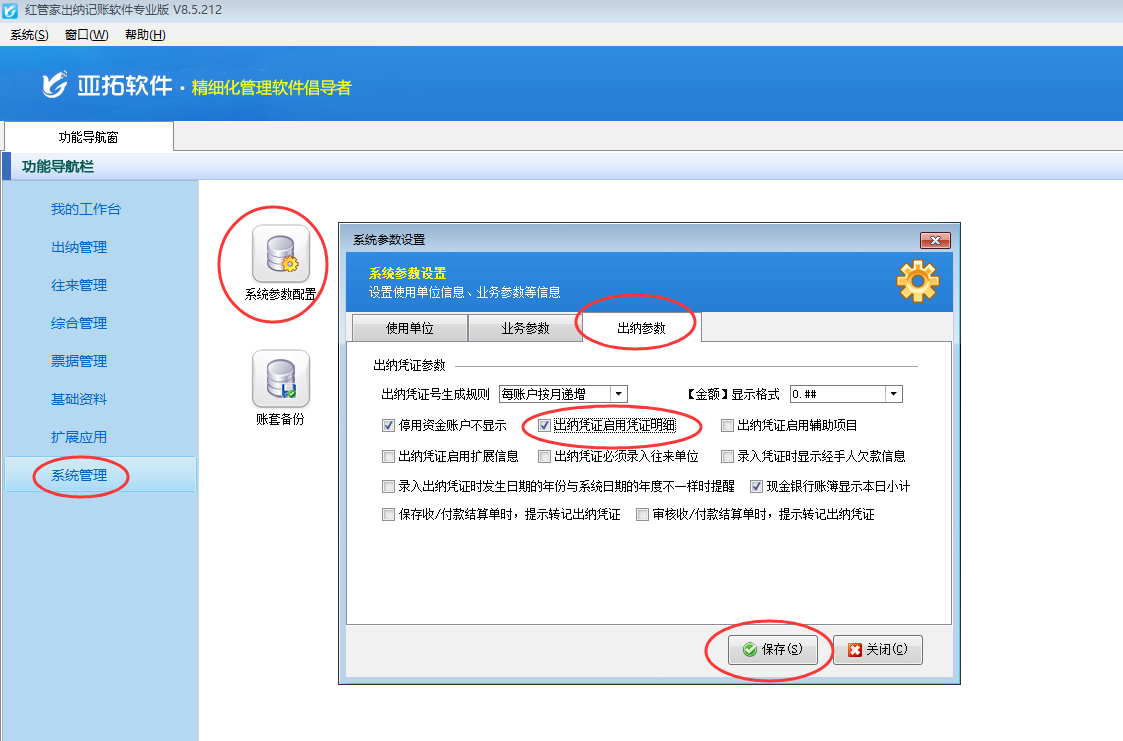 ????在功能導(dǎo)航窗點(diǎn)擊“系統(tǒng)管理”—》“系統(tǒng)參數(shù)配置”—》“出納參數(shù)”打開出納參數(shù)配置界面,然后啟用參數(shù)“出納憑證啟用憑證明細(xì)”、“出納憑證啟用輔助項(xiàng)目”,如下圖所示。