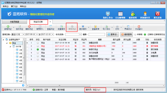 ????設(shè)置權(quán)限完成后,使用操作員“張亞”登錄軟件并打開現(xiàn)金及銀行日記賬列表,可以看到操作員只能查看自己錄入的憑證,無法查看其他人員錄入的憑證,如下圖所示: