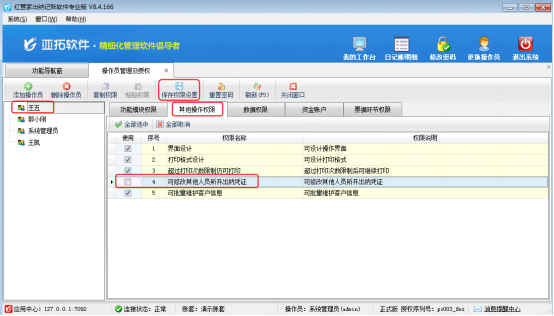 ????系統(tǒng)管理員登錄軟件,在功能導(dǎo)航窗點(diǎn)擊“系統(tǒng)管理”—》“操作員及授權(quán)”,進(jìn)入“操作員管理及授權(quán)”界面,如下圖所示,選擇一個(gè)操作員,以操作員“張亞”為例,點(diǎn)擊“其他操作權(quán)限”,然后取消勾選“可修改其他人員所開出納憑證”,最后點(diǎn)擊“保存權(quán)限設(shè)置”,權(quán)限設(shè)置成功。