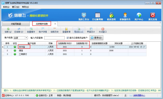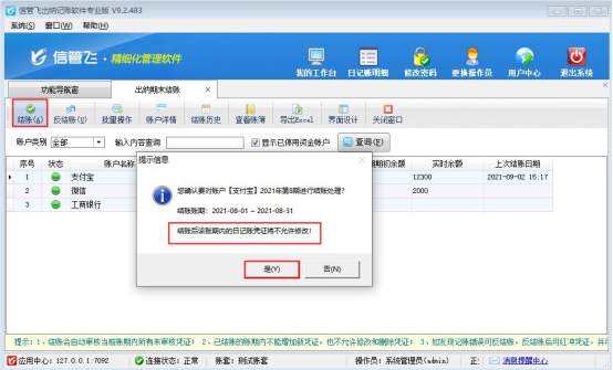 ????對資金賬戶“支付寶”進(jìn)行結(jié)賬處理,選擇賬戶名稱為“支付寶”的記錄,點(diǎn)擊工具欄的“結(jié)賬”按鈕,系統(tǒng)會(huì)彈出提示“結(jié)賬賬期:2021-08-01~2021-08-31,結(jié)賬后該賬期內(nèi)的憑證將不允許修改!”,點(diǎn)擊是,賬期會(huì)轉(zhuǎn)入下一賬期,如下圖所示: