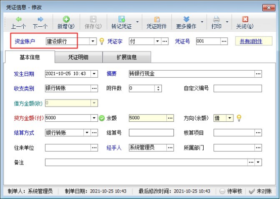 ????首先登記建設(shè)銀行的日記賬,銀行資金轉(zhuǎn)出,日記賬需要登記憑證字為“付”的憑證記錄,摘要和收支類別可選擇轉(zhuǎn)銀行現(xiàn)金,如下圖所示: