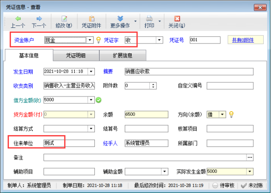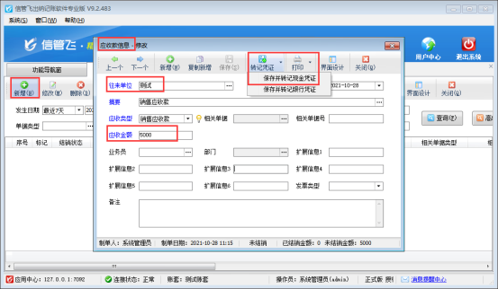 ????功能導(dǎo)航窗“往來管理”—》“應(yīng)收款管理”中,新增一筆客戶“測試”的應(yīng)收款記錄,應(yīng)收金額5000元,保存并轉(zhuǎn)記現(xiàn)金憑證,如下圖所示: