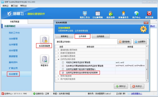 ????在“功能導(dǎo)航窗”點(diǎn)擊“系統(tǒng)管理”—》“系統(tǒng)參數(shù)配置”,啟用“業(yè)務(wù)參數(shù)”中的“出納憑證審核時(shí)自動(dòng)審核相關(guān)的結(jié)算單”參數(shù),如下圖所示: