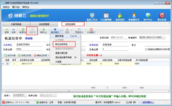 ????參數(shù)啟用完成后,在“往來管理”中打開應(yīng)收款管理,選擇狀態(tài)為“未結(jié)銷”的應(yīng)收款記錄,點(diǎn)擊收款結(jié)算,在彈出的結(jié)算單界面上,正常結(jié)算應(yīng)收款,保存結(jié)算單后在“更多操作”下點(diǎn)擊“轉(zhuǎn)記出納憑證”(需要自動(dòng)提醒轉(zhuǎn)記可參考此文章設(shè)置:出納軟件如何設(shè)置結(jié)算單保存或?qū)徍藭r(shí)提醒轉(zhuǎn)記日記賬?),如下圖所示:
